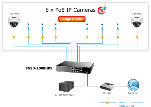 W odróżnieniu do standardowych switchy do zastosowań w systemach monitoringu, które są wyposażone w 12 lub 24 porty PoE, FGSD-1008HPS ma 8 portów 802.3at, dzięki czemu nadaje się do średnich i dużych systemów monitoringu, przy zachowaniu atrakcyjnej ceny. Dzięki wysokiej wydajności i całkowitemu budżetowi mocy PoE wynoszącemu 125 W, switch może zasilać 8 kamer IP oraz zapisywać je na 8-kanałowym rejestratorze NVR. Taki zestaw może być łatwo zarządzany i obsługiwany lokalnie, lub zdalnie - przez Internet.
