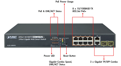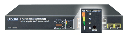 Planet FGSD-1008HPS Inteligentny switch z 8 portami 10/100TX 802.3at PoE i 2 portami Gigabit TP / SFP
