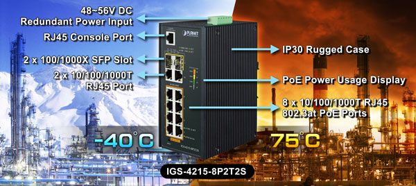 Zaprojektowany do instalacji w trudnych, wymagających warunkach przemysłowych, IGS-4215-8P2T2S jest nowym członkiem rodziny przełączników PLANET klasy przemysłowej. Inteligentne funkcje PoE firmy PLANET poprawiają dostępność krytycznych aplikacji biznesowych. IGS-4215-8P2T2S może działać niezawodnie, stabilnie i cicho w każdych warunkach bez wpływu na jego wydajność. Posiada całkowity budżet mocy do 240 watów dla różnych zastosowań PoE i temperaturach pracy w zakresie od -40 do 75 stopni C w wytrzymałej metalowej obudowie IP30.