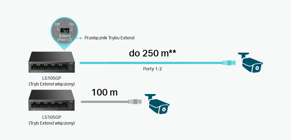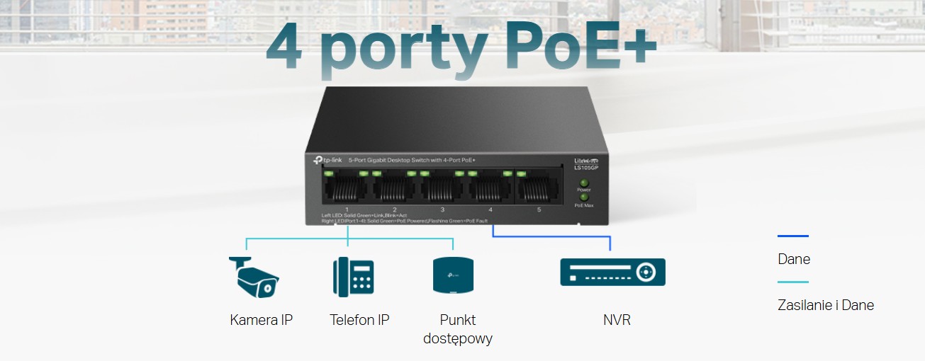 Przełącznik LS105GP zgodny ze standardami PoE IEEE 802.3af/at oferuje łączne zasilanie PoE do 65 W (do 30W na każdym porcie PoE).