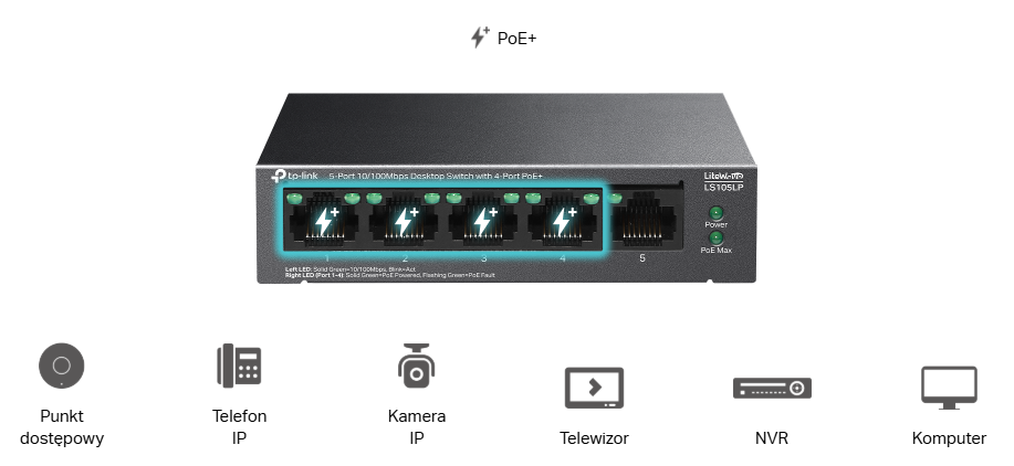 Przełącznik LS105LP zgodny ze standardami PoE IEEE 802.3af/at oferuje łączne zasilanie PoE do 41 W (do 30W na każdym porcie PoE). Gdy przekroczona zostanie całkowita moc 41 W, wtedy funkcja inteligentnego zarządzania energią wyłączy zasilanie portów o niższym priorytecie, aby uchronić urządzenia przed uszkodzeniami.