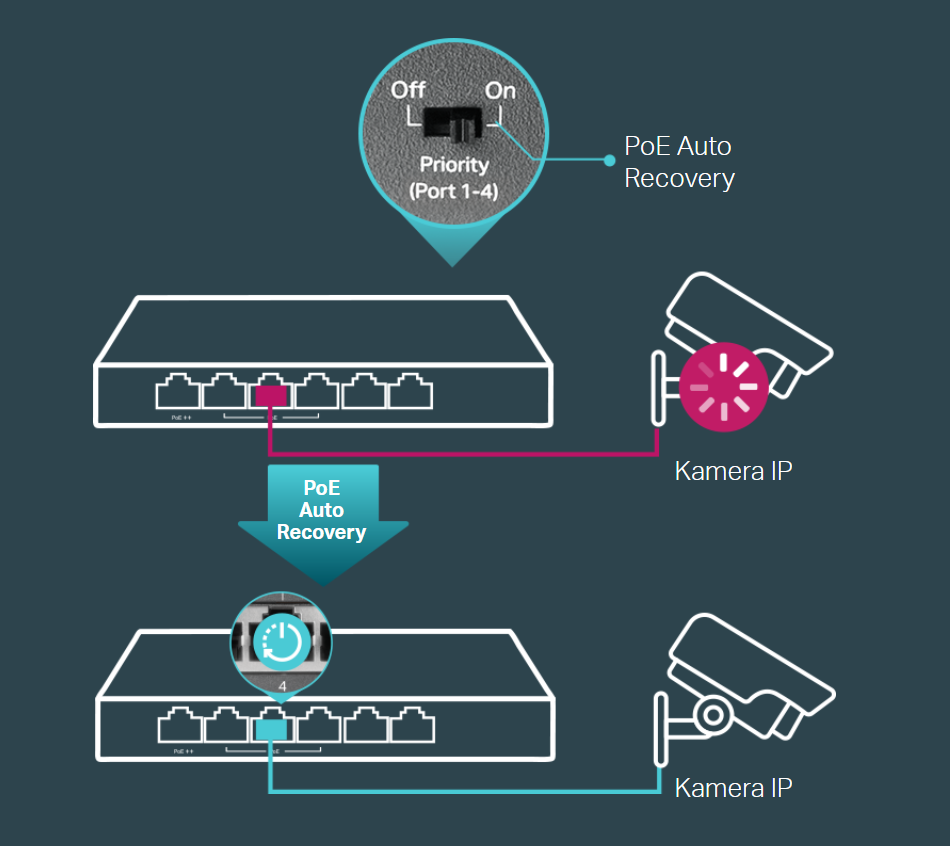 Przełącznik automatycznie wykrywa i ponownie uruchamia urządzenia zasilane przez PoE, takie jak kamery oraz punkty dostępowe, gdy przejdą offline lub przestaną odpowiadać. Gwarantuje to stabilność ich działania bez potrzeby monitorowania ich działania i ręcznego restartowania.