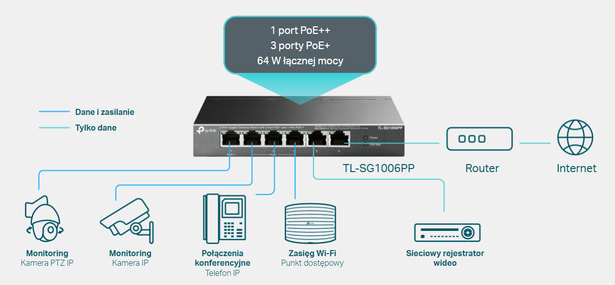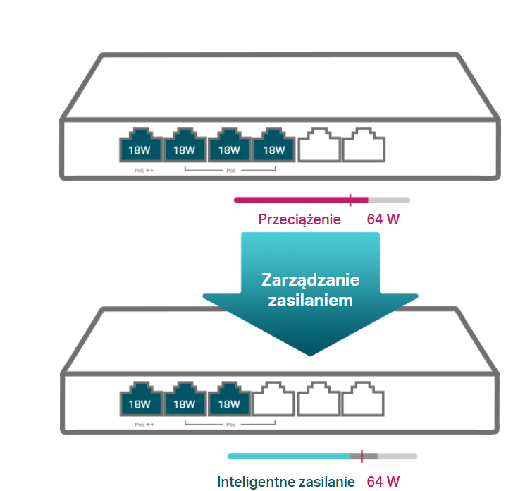 Gdy całkowity pobór mocy przekroczy 64 W, funkcja inteligentnego zarządzania zużyciem energii wyłączy zasilanie portu o najniższym priorytecie, aby zapewnić zasilanie portów o wyższych priorytetach i tym samym chronić urządzenie przed przeciążeniem. Funkcja ta umożliwia także automatyczne wykrywanie wymaganej mocy PoE przez dane urządzenie i chroni urządzenia nieobsługujące PoE przed uszkodzeniem.