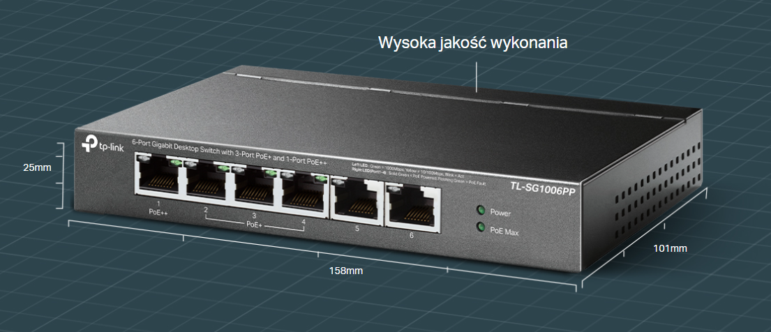 Ochronę dla wrażliwych komponentów przełącznika stanowi wytrzymała obudowa, wykonana z metalu wysokiej jakości. Tak solidne zabezpieczenie gwarantuje wieloletnią i stabilną pracę urządzenia. TL-SG1006PP to produkt niezawodny, co potwierdzają liczne testy bazujące na rygorystycznych standardach.
