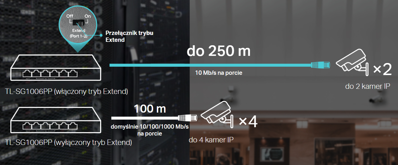 W trybie Extend, zasięg transmisji PoE sięga nawet 250 m, dzięki czemu przełącznik jest doskonałym rozwiązaniem w przypadku rozmieszczania kamer IP na dużym obszarze.