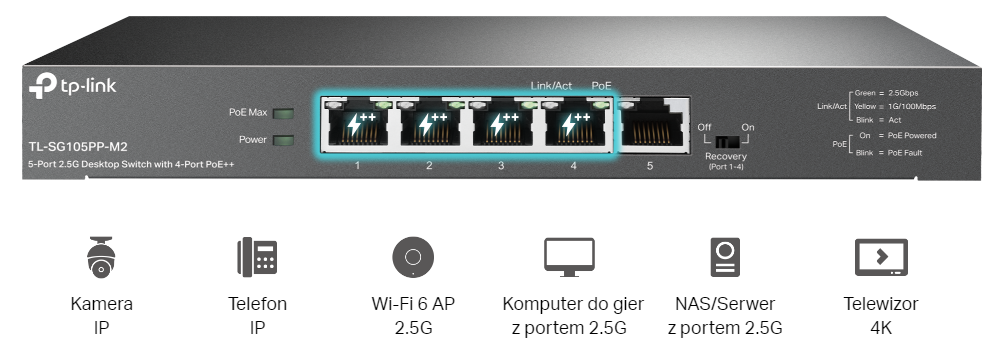 TL-SG105PP-M2 oferuje 2,5 razy wyzszą prędkość, niż zwykłe, gigabitowe przełączniki. Działa z kablami kategorii 5e, 6, 6a i wyższych, dzięki czemu nie trzeba modernizować okablowania.