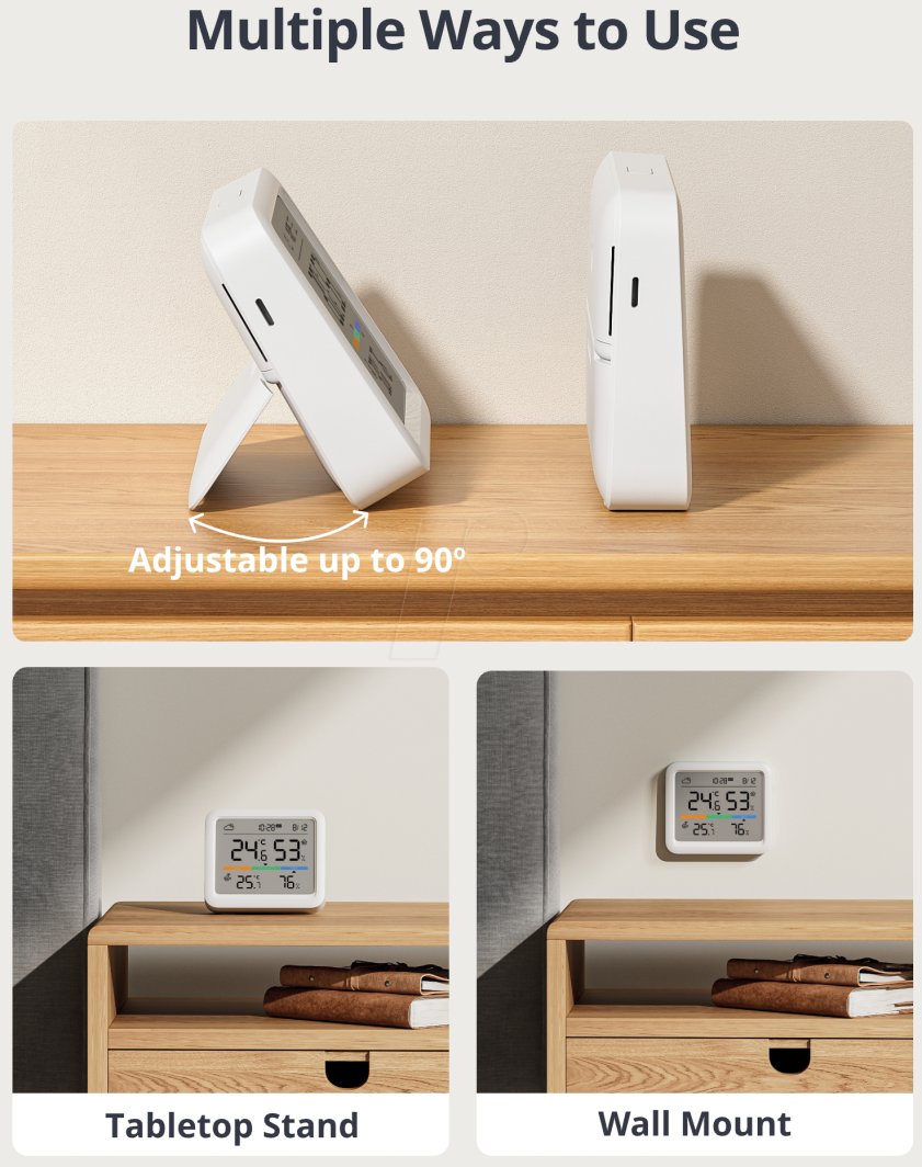 Ta wielofunkcyjna stacja pogodowa działa jako 5-w-1, oferując nie tylko pomiar temperatury i wilgotności, ale także wyświetlanie godziny, daty, poziomu komfortu oraz prognoz pogody (wymaga SwitchBot Hub). Dodatkowo, SwitchBot Meter Pro umożliwia monitorowanie dwóch zewnętrznych czujników, co pozwala na porównanie warunków w różnych lokalizacjach, takich jak pokoje, ogrody czy szklarnie.
