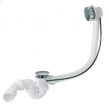 Zestaw odpływowo-przelewowy do wanny i głębokiego brodzika z pokrętłem i korkiem umożliwiającym zamknięcie i otwarcie odpływu.