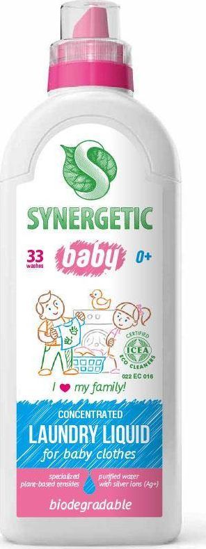Certyfikowany, biodegradowalny środek do prania odzieży dziecięcej 0+ Synergetic jest równie skuteczny, jak tradycyjne środki do prania, a przy tym w pełni przyjazny dla środowiska naturalnego i użytkowników. Środek do prania przeznaczony jest do prania w pralkach różnego rodzaju oraz prania ręcznego w temperaturze 20-90°;. Nadaje się do wszystkich rodzajów tkanin, usuwa wszystkie rodzaje plam. Bez barwników i substancji aromatyzujących. Całkowicie wypłukuje się z tkanin. Produkt posiada bardzo restrykcyjny certyfikat ICEA Eco Cleaners i jest w 100% biodegradowalny. Biodegradowalne produkty nie naruszają naturalnej równowagi szamba, gdzie bytują pożyteczne bakterie, rozkładające to, co do niego wpada. Opakowania Synergetic są wykonane z polietylenu wysokiej gęstości (HDPE), który rozkłada się, np. przy spaleniu, na wodę i dwutlenek węgla, w przeciwieństwie np. do PET czy PVC, które podczas rozkładu emitują szkodliwe gazy.