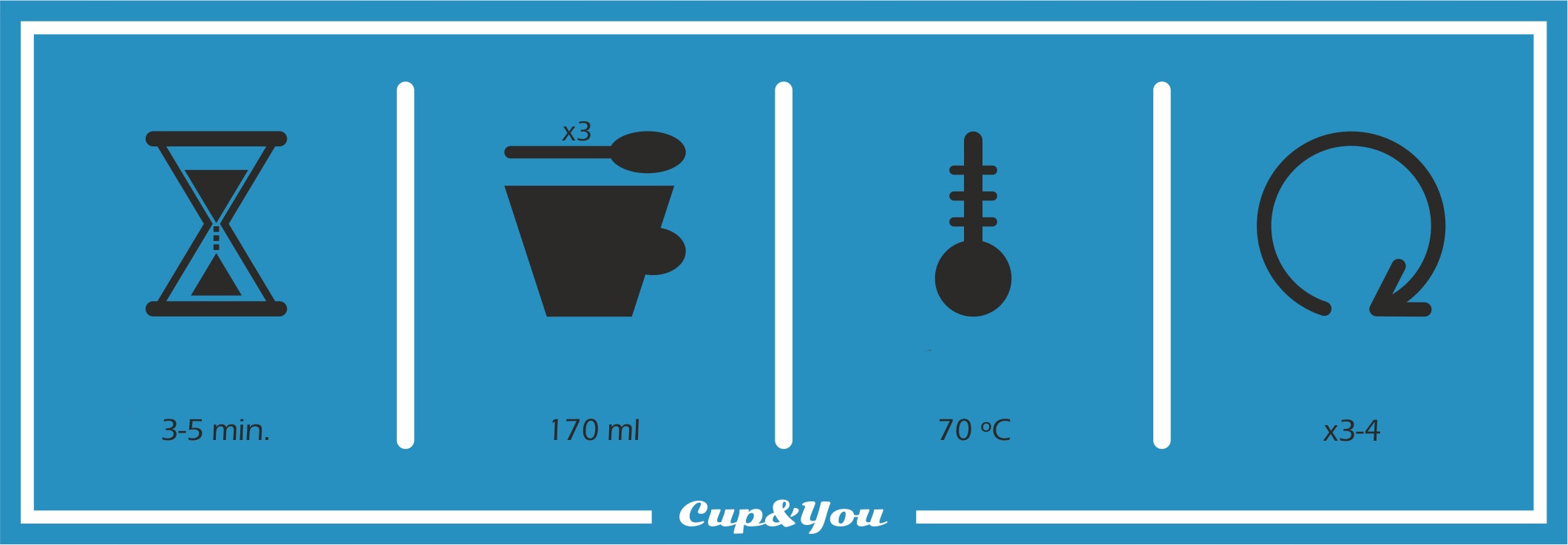 Parzymy wodą o temperaturze 70° C, 3-5 minut (w zależności od upodobań związanych z intensywnoscią naparu), 3 łyżeczki suszu na 170ml wody (mała filiżanka), można parzyć 3-4 razy.