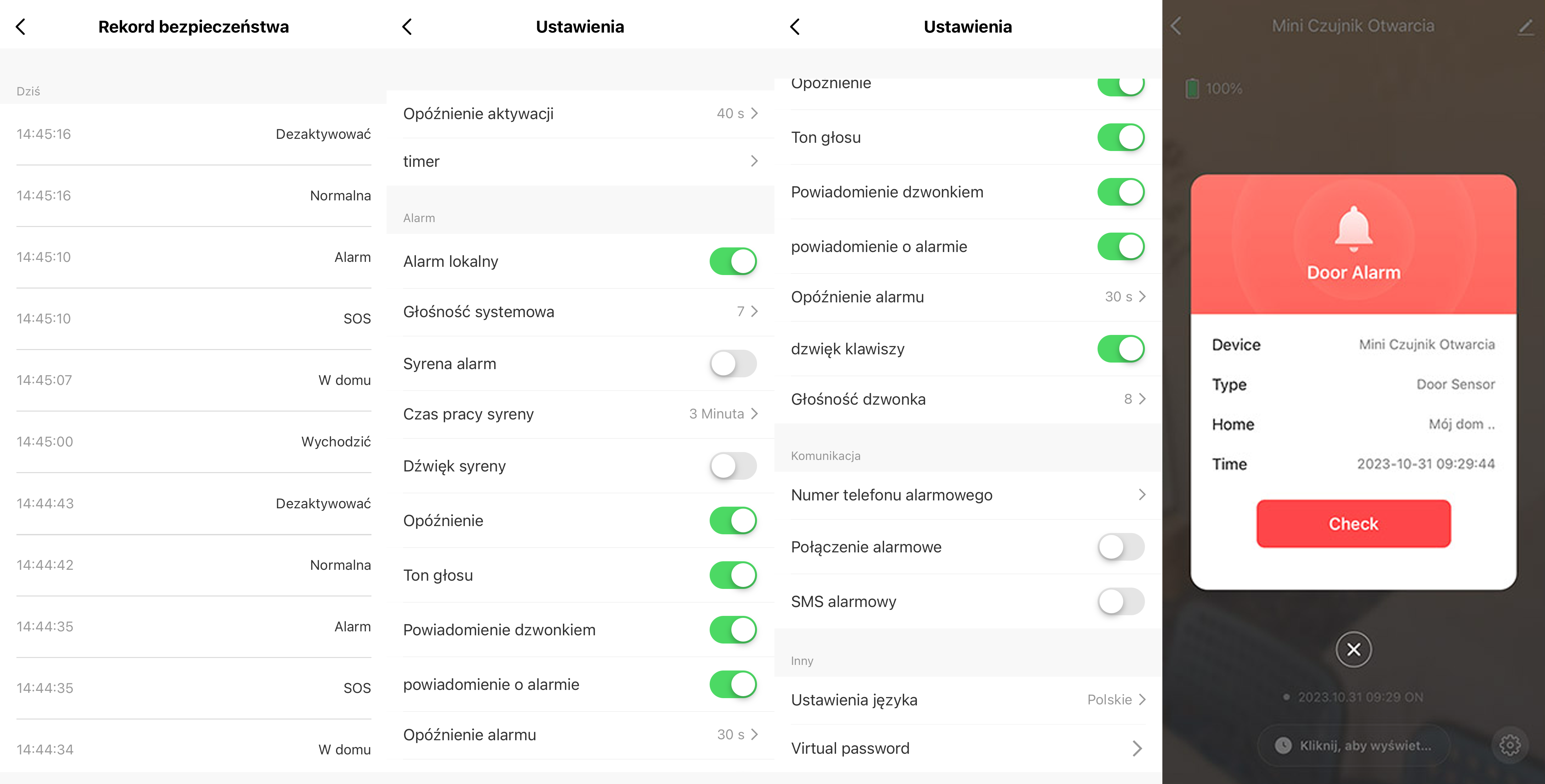 System alarmowy, oferuje zaawansowane zarządzanie i dostosowywanie ustawień bezpieczeństwa. W aplikacji użytkownicy mają dostęp do dokładnej historii zdarzeń, która rejestruje każdy ruch czujników, alarmów SOS oraz zmiany statusów systemu, takie jak uzbrajanie i rozbrajanie alarmu. Zapewnia to pełną świadomość sytuacji w domu lub firmie i pozwala na szybkie reagowanie na potencjalne zagrożenia.