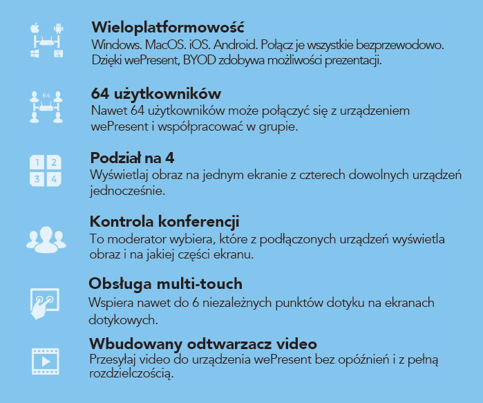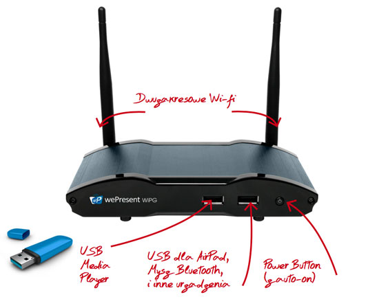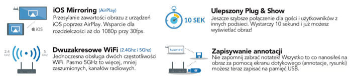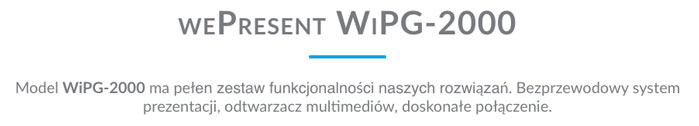 WiPG-2000S zapewnia bezprzewodową, dwukierunkową komunikację komputerów PC/MAC oraz urządzeń mobilnych z dowolnym projektorem, monitorem lub tablicą interaktywną.