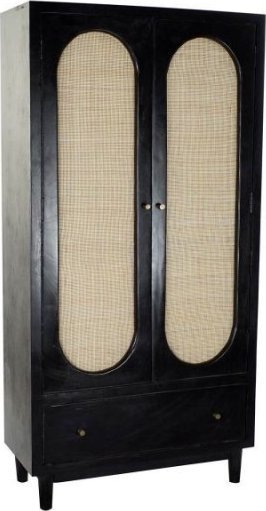 Dwudrzwiowa szafa została wykonana z drewna mango. Została wyposażona w drążek do wieszania ubrań, półkę - w dolnej części - oraz w szufladę. Drzwi ozdobiono plecionką wiedeńską z rattanu. Mebel został wykonany z naturalnego materiału, więc może mieć przebarwienia, rysy, słoje itp. niedoskonałości.