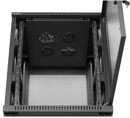 Aby zapewnić optymalną wentylację, szafa została wyposażona w sufitowy panel wentylacyjny z dwoma wentylatorami. To rozwiązanie umożliwia skuteczne odprowadzanie ciepła, co jest kluczowe dla długotrwałej pracy zainstalowanych urządzeń.