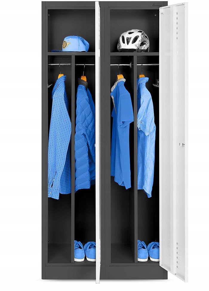Ten model charakteryzuje się dwuskrzydłową budową z dwiema komorami, drążkami oraz haczykami na ubrania, co zapewnia wystarczającą przestrzeń na rzeczy osobiste. Dzięki przemyślanej konstrukcji, użytkownicy mogą łatwo zorganizować swoje ubrania oraz akcesoria.