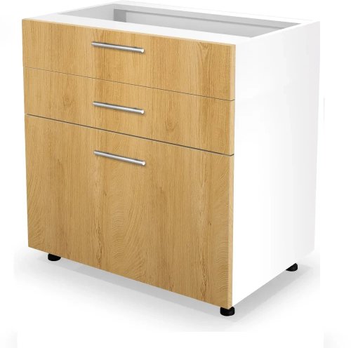 Szafka kuchenna stojąca 80 VENTO D3S-80/82 z trzema szufladami Szafka kuchenna stojąca 80 VENTO D3S-80/82 wykonana jest z płyty meblowej laminowanej w kolorze białym oraz jej fronty z płyty MDF w kolorze dąb miodowy o matowym wykończeniu. Szafka wyposażona jest w 3 szuflady, które są funkcjonalnym elementem mebli kuchennych. W szufladach możemy przechowywać wszystko, od drobiazgów kuchennych po garnki, talerze, kubki. Mechanizm Hettich oraz mechanizm cichego domykania szuflad Linken System to inwestycja w komfortowy mebel. Szuflady w szafce zamykają się płynnie i niemal bezgłośnie. Cichy domyk nie tylko zwiększa komfort użytkowania, ale zapewnia dłuższą żywotność produktu. Poręczne metalowe uchwyty ułatwiają otwieranie i zamykanie szuflad. Szafka wsparta jest na regulowanych stopkach w kolorze czarnym, które ułatwią zachowanie poziomu w razie krzywizn podłóg. Prezentowany model szafki to doskonały wybór dla wszystkich tych, którzy cenią sobie funkcjonalne, ponadczasowe i solidne meble. Połącz szafkę Vento D3S-80/82 z pozostałymi meblami z kolekcji VENTO i stwórz nowoczesną kuchnię na miarę własnych potrzeb. Cechy produktu szafka stojąca, korpus z płyty laminowanej 16mm w kolorze białym, front z płyty MDF 16mm w kolorze dąb, 3 szuflady, mechanizm Hettich, mechanizm cichego domykania szuflad Linken System, uchwyty metalowe o szerokości 128 mm, regulowane stopki z tworzywa w kolorze czarnym, szafka sprzedawana bez blatu i maskownicy, maskownica dostępna jest jako osobny produkt, blat należy zakupić we własnym zakresie, nie wykonujemy projektów kuchni, do samodzielnego montażu, w swojej ofercie posiadamy szeroki wybór mebli pozwalających na kompleksowe wyposażenie mieszkania.