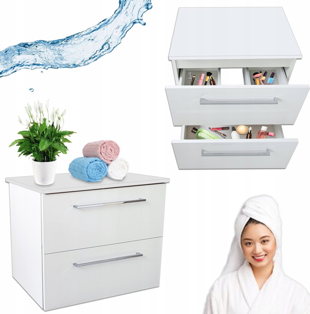 Szafka Łazienkowa 60 Biała Wisząca z Blatem 2 Szuflady Połysk Cichy Domyk