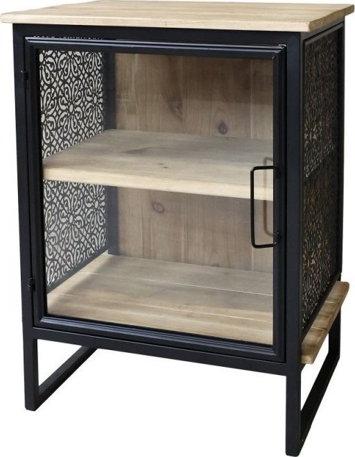 Bardzo ciekawa szafka nocna wykonana z metalu malowanego proszkowo na kolor czarny. Boczne ściany mają piękne, ażurowe wycięcie. Drzwi przeszklone. Wewnątrz półki wykonane z drewna jodłowego.