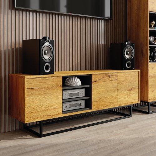 Szafka została wyposażona w trzy otwarte kompartmenty, które przedzielają dwie praktyczne półki, idealne na sprzęt RTV, dekodery czy konsole. Dodatkowo mebel oferuje trzy fronty z systemem push to open, za którymi znajduje się zamknięta przestrzeń do przechowywania – idealna na wszystko, co warto mieć pod ręką, ale niekoniecznie na widoku.