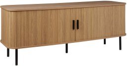 Retro komoda pod telewizor z rozsuwanymi drzwiami. Ożyw swoją przestrzeń dzięki temu stoliku pod telewizor i zorganizuj pokój dzięki jego konstrukcji. Ten elegancki mebel posiada stylowe, przesuwne drzwi, za którymi umieszczono cztery przestronne półki, zapewniając dużo miejsca do przechowywania książek, akcesoriów do telewizora oraz innych niezbędnych przedmiotów. Oprócz tego szafka wyposażona jest w cztery otwory na kable, co zapobiegnie ich plątaniu oraz utrzyma je poza zasięgiem wzroku. Retro design mebla, w połączeniu z jego jasnym odcieniem i czarnymi nogami na pewno wyróżni go spośród innych mebli i umożliwi dopasowanie do różnych stylów wnętrzarskich. Co więcej, wysokiej jakości materiały - płyta MDF, z której zrobiono mebel, oraz sosna, z której wykonano rączki - użyte w jego konstrukcji gwarantują łatwe czyszczenie oraz wytrzymałość, czyniąc go praktycznym i stylowym dodatkiem do domu.
