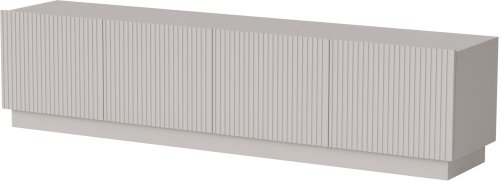 Szafka RTV LIVERTI to stylowa propozycja o wymiarach 200x42x48 cm, która harmonijnie łączy nowoczesny design z praktycznością. Wykonana z materiałów najwyższej jakości, szafka wyróżnia się ryflowanymi frontami, które nadają jej wyjątkowy charakter. Matowe wykończenie w odcieniu kaszmiru wprowadza przytulność do przestrzeni, a osadzenie na cokole podkreśla nowoczesny styl mebla.