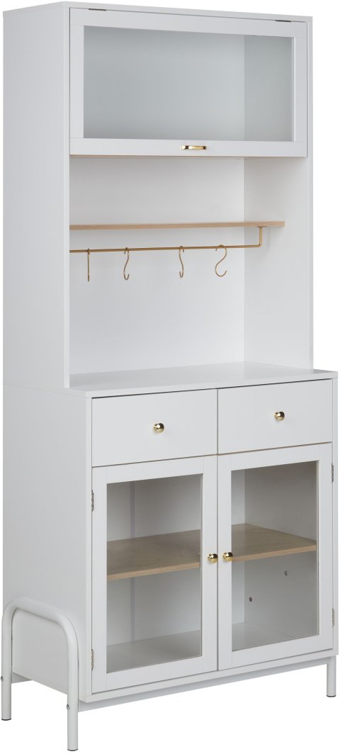 Dekoracyjna szafka ze szklanymi gablotami. Ta elegancka biała gablota to doskonały dodatek do Twojej jadalni lub kuchni. Posiada szklane drzwi, szuflady i półki oraz wieszak na kubki do twojej ulubionej kawy, co sprawia, że jest zarówno stylowa, jak i funkcjonalna. Doskonale nadaje się do wyeksponowania Twojej porcelany lub dekoracji za eleganckimi szklanymi drzwiami, jednocześnie zapewniając organizację niezbędnych przedmiotów w wygodnych szufladach i półkach. Dzięki swojemu prostemu białemu wykończeniu ta gablota doskonale komponuje się z każdym stylem wnętrz, dodając Twojej przestrzeni szykowności.