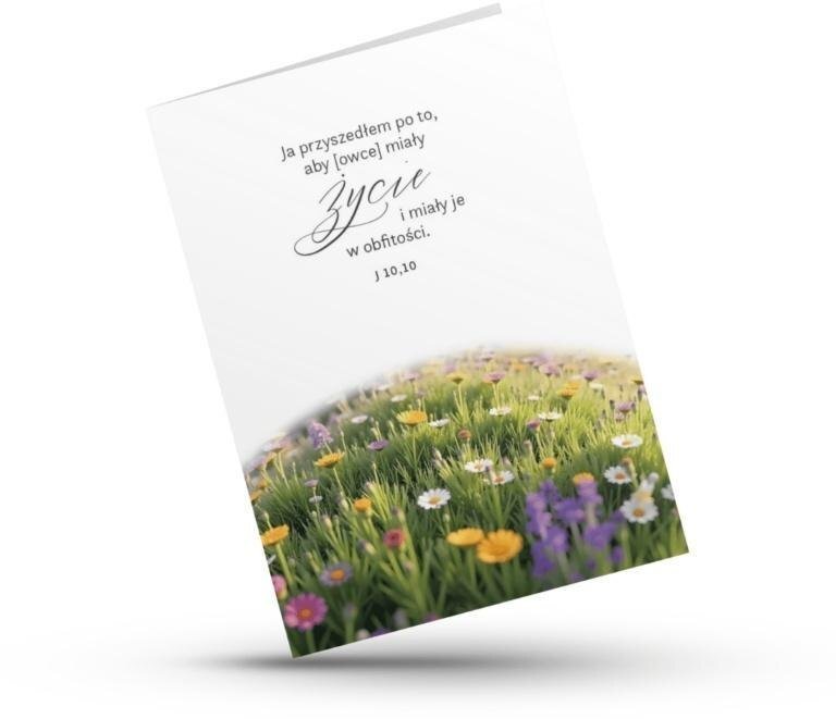Kartka z cytatem z Ewangelii Jana 14,6 to wyjątkowe przesłanie nadziei i wiary w Jezusa Chrystusa jedyną drogę do Ojca. Urokliwa ilustracja w odcieniach zieleni przedstawia spokojny krajobraz z polną ścieżką i strumieniem.