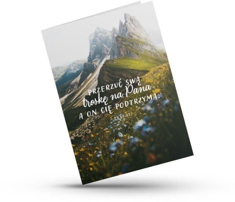 Kartka z cytatem z Psalmu 55,23 zachęca, by oddać Bogu swoje zmartwienia i zaufać Jego opiece. Urokliwy widok gór wiosną podkreśla przesłanie o pokoju i sile w chwilach trudności. Idealna na każdą okazję, gdy chcesz przekazać komuś otuchę i wsparcie.