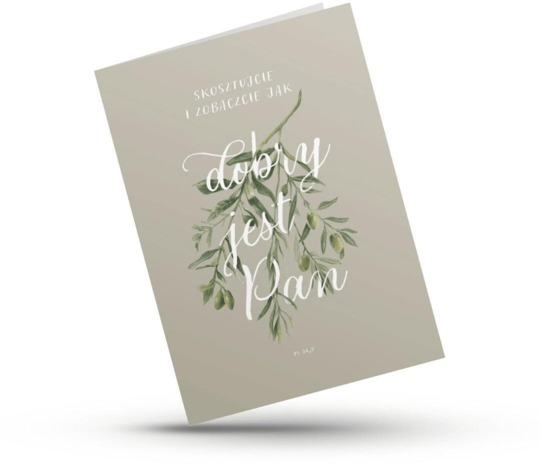 Piękna kartka z cytatem z Psalmu 34,9 to proste, a zarazem głębokie przesłanie o Bożej dobroci. Subtelny, oliwkowy motyw i delikatna typografia nadają jej naturalny, elegancki charakter. Idealna jako kartka z błogosławieństwem, podziękowaniem lub słowem zachęty dla bliskiej osoby.
