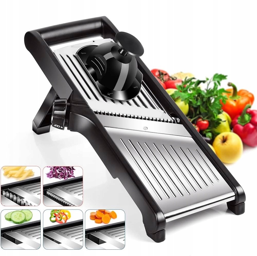 To wszechstronne narzędzie oferuje pięć różnych możliwości krojenia: paski o grubości 3 mm i 9 mm oraz plasterki o grubości 3 mm, 6 mm i 9 mm. Dzięki regulacyjnemu pokrętłu, łatwo dostosujesz grubość krojenia do swoich potrzeb, co zwiększa komfort użytkowania.