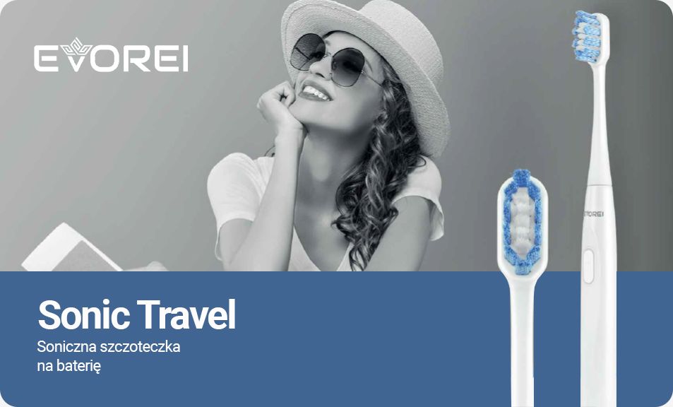 Evorei Sonic Travel to szczoteczka soniczna zasilana na baterie. Możesz zabrać ja ze sobą w podróż, na biwak i wszędzie tam, gdzie nie znajdziesz prądu.