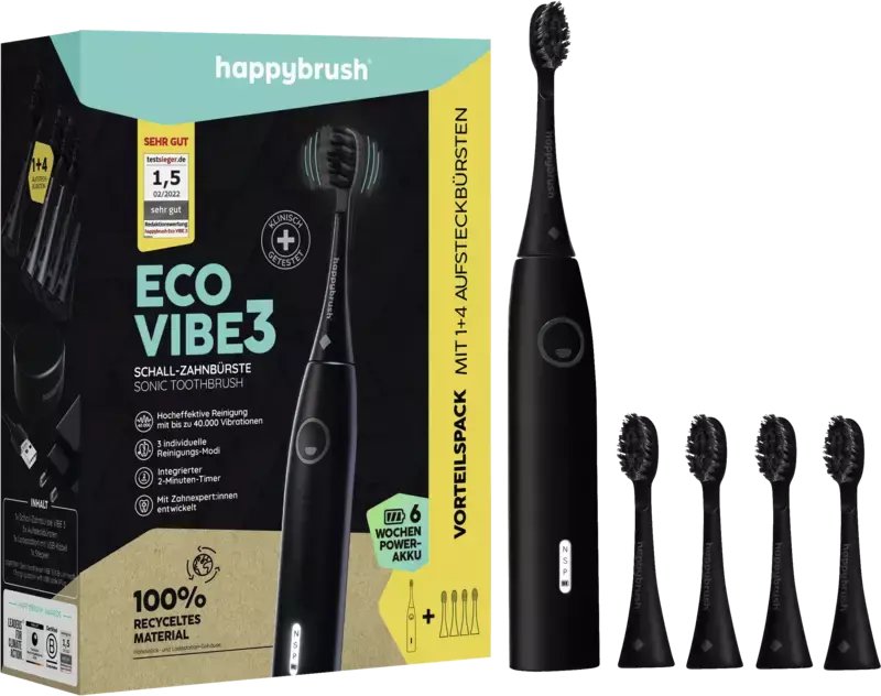 Odkryj nowy wymiar codziennej pielęgnacji jamy ustnej z elektryczną szczoteczką do zębów Happybrush ECO VIBE 3 Starter Kit*. Ten elegancki zestaw w całkowicie czarnym kolorze łączy nowoczesny design z zaawansowaną technologią, co zapewnia skuteczne i komfortowe szczotkowanie.