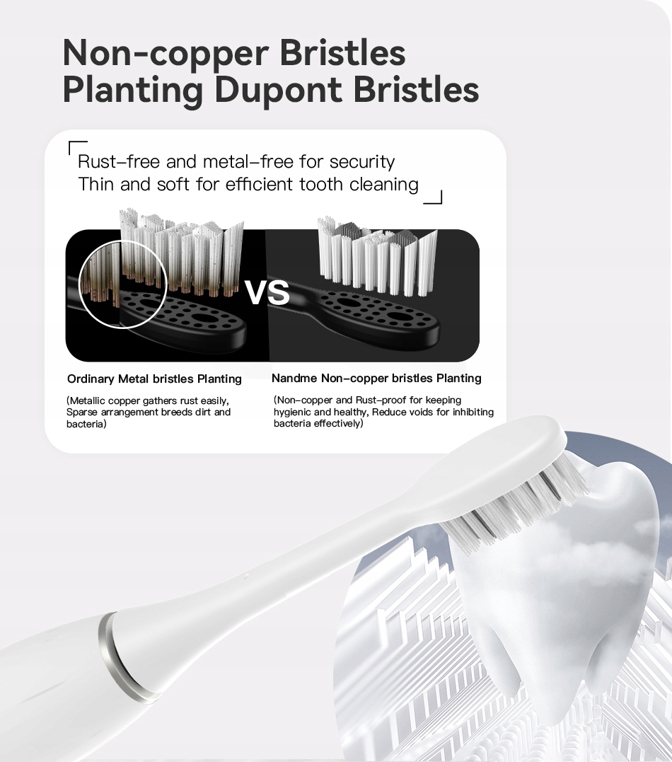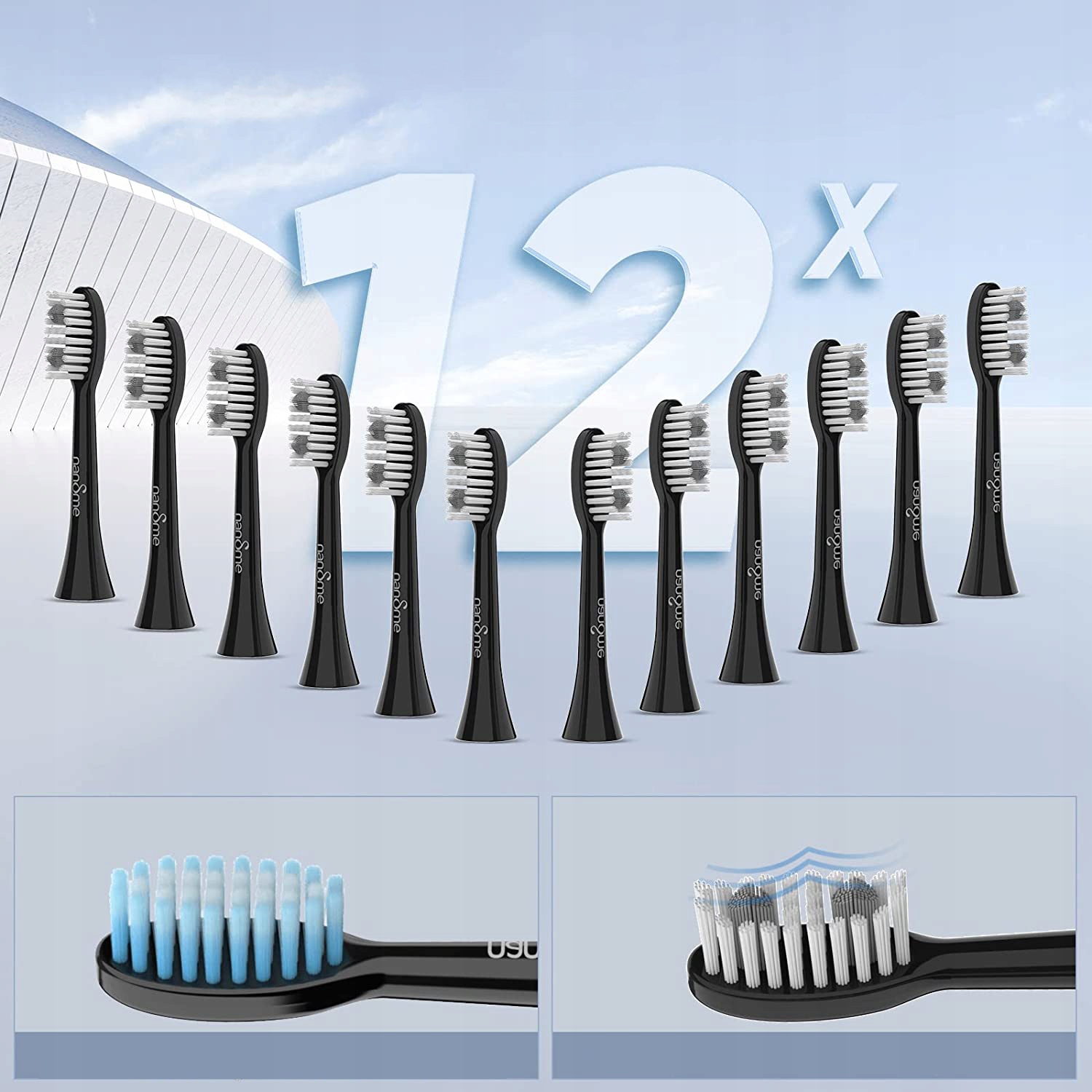 Ta elektryczna szczoteczka do zębów oferuje 12 czarnych głowic szczoteczki z włosiem, należy unikać częstego zamawiania nowych głowic zamiennych, 6 głowic szczoteczek DuPont, które są zaprojektowane w kształcie litery "W" i idealnie pasują do dziąseł i zębów, a 6 miękkich głowic w kształcie litery U lepiej nadają się do delikatnych zębów i delikatnie pielęgnują zdrowe dziąsła.