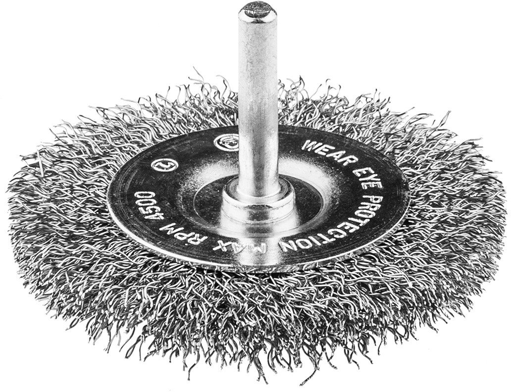 Szczotka druciana tarczowa 75 mm, drut karbowany, INOX, z trzpieniem 6 mm