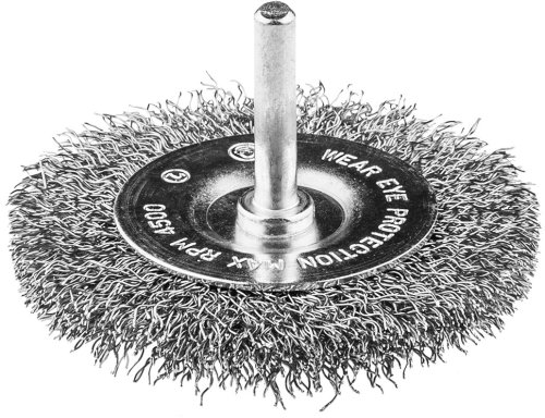 Szczotka druciana tarczowa z trzpieniem, miękka, średnica 75 mm, drut stalowy INOX, falowany, o średnicy 0.3 mm, max. prędkość obrotowa 4 500 obr/min., trzpień 6 mm