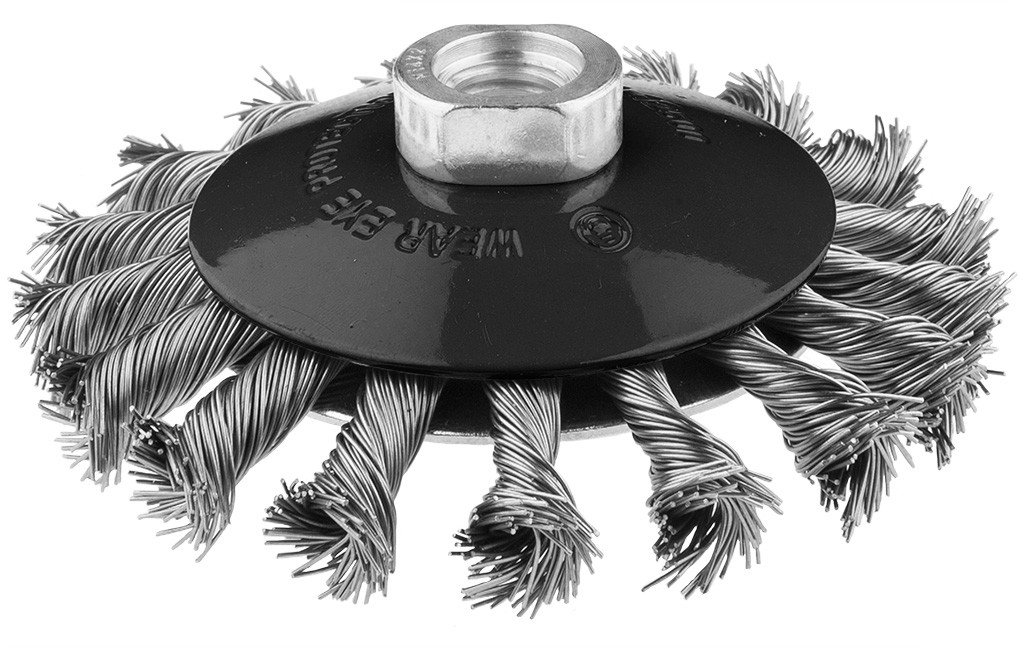 Szczotka druciana tarczowa odgięta 100 mm, drut skręcony, INOX, M14