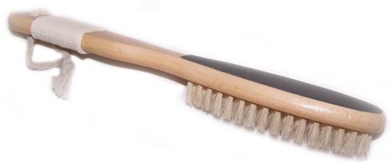 Szczotka i Złuszczacz. Wymiary 24 x 8 cm. Szczotka wykonana z drewna hemu oraz średnio twardego włosia z dzika. Materiały bardzo odporne na zużycie i pozwalające na długie użytkowanie. Dwustronna szczotka z włosiem po jednej stronie oraz złuszczaczem, po drugiej. Złuszczacz pomaga usunąć martwy naskórek z ciała a szczególnie przydatny jest w przypadku szorstkiej skóry stóp. Szczotka głęboko oczyszcza skórę i sprawia, że staje się ona bardziej miękka. Nie musisz mocno dociskać, ponieważ włosie wykona całą pracę za Ciebie, ułatwiając złuszczanie! Pomaga zapobiegać wrastaniu włosów i sprawia, że skóra znów wygląda jak nowa!