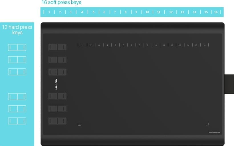 Tablet posiada 12 programowalnych, fizycznych przycisków na swojej powierzchni, 16 programowalnych pól funkcyjnych oraz 2 przyciski na piórze, do których można przypisać najczęściej używane funkcje, kombinacje klawiszy, skróty itp. Zapewnia to wyjątkowe możliwości konfiguracji tabletu. Tablet jest przystosowany dla osób prawo- i leworęcznych.
