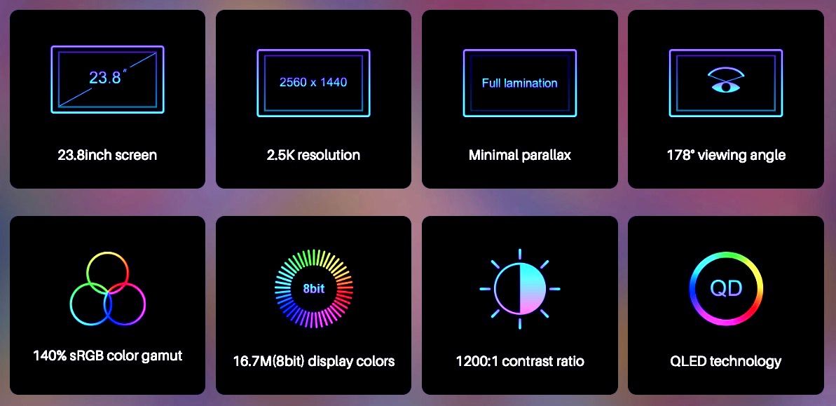 Tablet graficzny Huion Kamvas 24 PLUS to przedstawiciel nowej serii tabletów graficznych Huion z matrycami o rozdzielczości QHD (2560x1440 pikseli). Zastosowana w tej wersji modelu w pełni laminowana matryca w technologii Quantum Dot o przekątnej 23,8 cala zapewnia bardzo duży obszar roboczy, a wysoka rozdzielczość i pokrycie 140% gamy sRGB daje świetne odwzorowanie każdego detalu oraz żywe kolory. Pióro obsługuje 8192 stopnie nacisku oraz wykrywanie kąta nachylenia +/- 60 stopni, co sprawia, że rysowanie jest płynne.