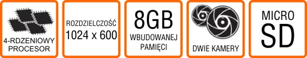 Tablet wyposażono w 8 GB pamięci wbudowanej. To podstawowa pojemność, która będzie wystarczająca na kluczowe aplikacje oraz na niewielkie archiwum zdjęć, filmów i wiadomości. Mniejsza pojemność pamięci ułatwi utrzymanie porządku w urządzeniu – niepotrzebne pliki możesz na bieżąco usuwać, a szczególnie istotne materiały możesz przenosić na dysk komputera lub archiwizować w chmurze.