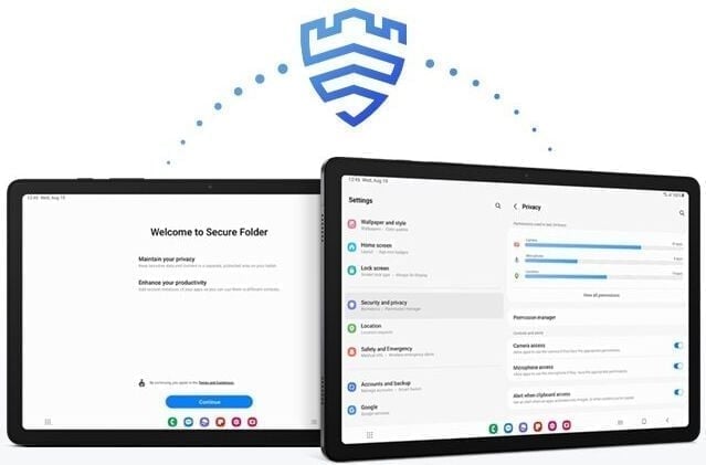 Przechowuj wszystkie informacje bezpiecznie. Ważne dane możesz ulokować w folderze Mój Sejf monitorując ogólny status bezpieczeństwa swojego urządzenia. Wyciągnij jak najwięcej ze swojego doświadczenia z tabletem Samsung Galaxy Tab A9+ , bez obaw o kwestie bezpieczeństwa.
