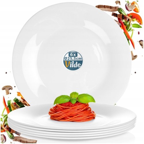 Talerze obiadowe płytkie szklane białe marki Vilde to znakomity wybór dla tych, którzy cenią sobie elegancję oraz funkcjonalność. Zestaw składający się z 6 talerzy o średnicy 25,5 cm doda klasy każdemu posiłkowi, zarówno codziennemu, jak i odświętnemu.