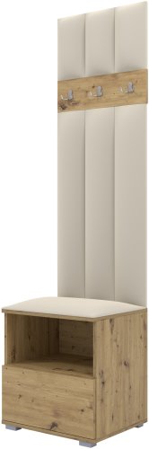 Tapicerowana garderoba Nela IV LUX to doskonałe połączenie nowoczesnego stylu i praktyczności, które idealnie sprawdzi się w każdym biurze. Wykonana z materiałów najwyższej jakości, ten elegancki mebel w kolorze dębu artisan z beżowymi, tapicerowanymi elementami, wprowadza do przestrzeni zarówno styl, jak i komfort.