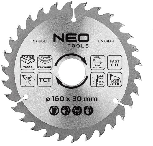 Tarcza do pilarki, widiowa, średnica 160 mm, średnica otworu montażowego 30 mm, 3 redukcje: 30 x 25.4 mm, 30 x 20 mm, 30 x 16 mm, max. prędkość obrotowa 11 000 obr./min, ilość zębów 30, wymiary zęba 2.8 mm x 2.0 mm, ząb z TCT (węglik spiekany), ząb o specjalnej geometrii ATB - Zęby wykonane z węglika wolframu o geometrii ATB (naprzemianległe) pozwalają na dokładne cięcie drewna i materiałów drewnopochodnych, takich jak sklejka, płyta wiórowa, MDF. Tarcza widiowa zapewnia szybkie cięcie, wykonana ze stali manganowej MN65