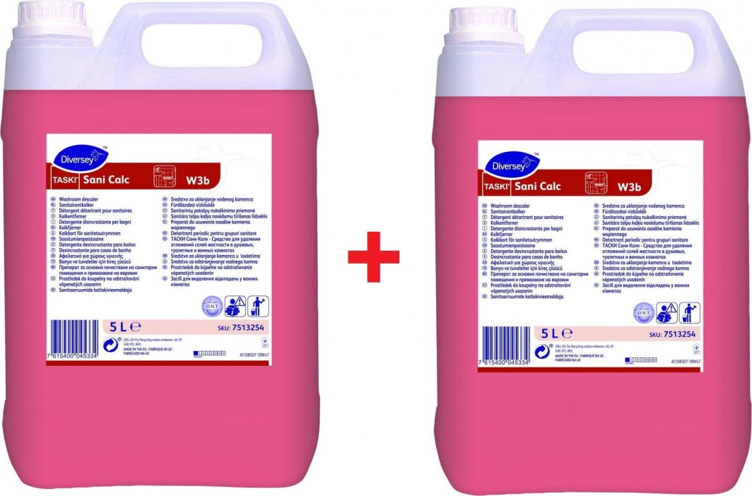TASKI Sani Calc jest mocno skoncentrowanym preparatem przeznaczonym do usuwania osadów z kamienia wapiennego z powierzchni kwasoodpornych. Dzięki specjalnej kompozycji kwasu fosforowego, związków powierzchniowo czynnych oraz inhibitorów korozji, produkt szybko i skutecznie usuwa kamień i nie jest agresywny chemicznie w stosunku do odkamienianych powierzchni. Przeznaczony jest do odkamieniania wszelkich kwasoodpornych powierzchni łazienkowych, np.: podłogi, ściany i inne.