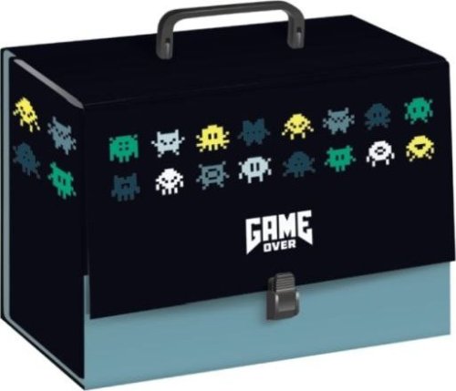 Stylowa teczka z rączką i zamkiem dla fanów gier wideo! 🎮 Wykonana z grubej, wytrzymałej tektury, która zapewnia bezpieczne przechowywanie bloków, prac plastycznych i notatek. Szerokie dno idealnie sprawdzi się do transportu farb, kubków oraz innych akcesoriów plastycznych. Plastikowe zapięcie i rączka gwarantują trwałość i wygodę użytkowania. Teczka ozdobiona motywami w stylu retro „Game Over” sprawi radość każdemu graczowi. 🌟