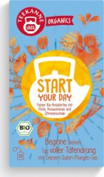 Teekanne Start your day. Typ produktu: Herbata ziołowa, Pojemność: 36 g, Główne składniki: Trawa cytrynowa, Lukrecja, Spearmint. Rodzaj opakowania: Papierowe pudełko
