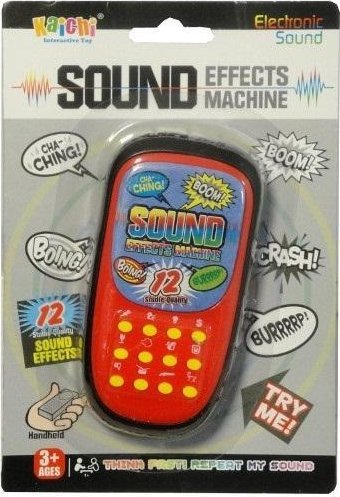 Mały telefon z 12 efektami dźwiękowymi. Dźwięki to m. in.: gwizdek, aplaus, bomba, bębenek. Zabawka działa na baterie typu AG13. Baterie znajdują się w zabawce. Produkt przeznaczony dla dzieci od 3 lat. Zabawka zapakowana w kartonową podstawkę z przezroczystym kloszem. Podane wymiary są wymiarami produktu w opakowaniu.