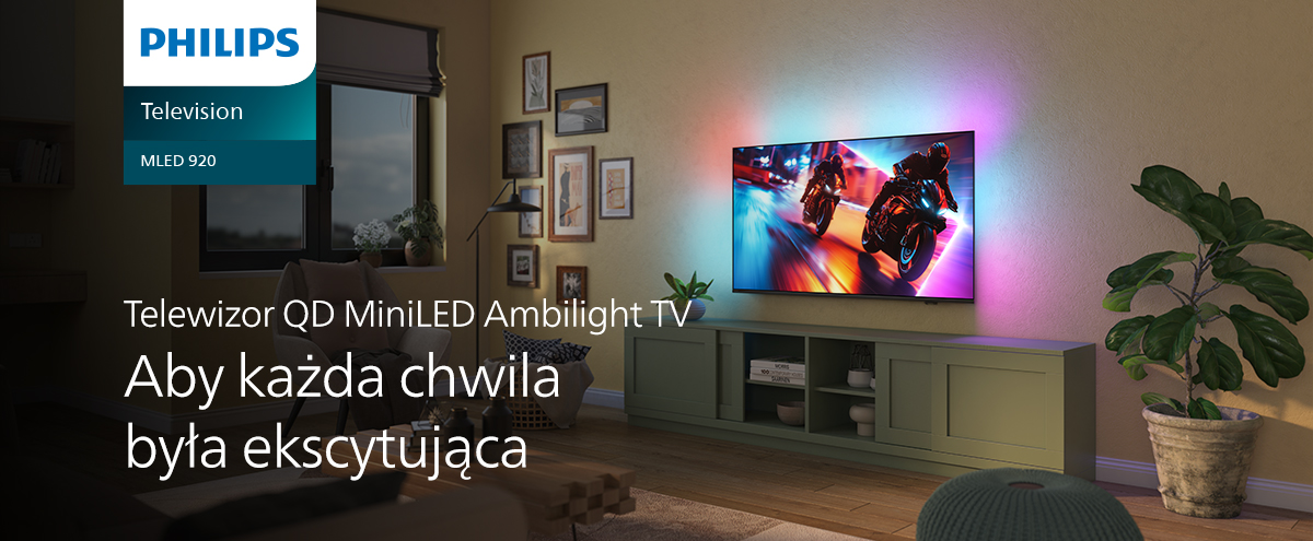 Ambilight to zupełnie nowy wymiar oglądania telewizji. Inteligentne podświetlenie LED reaguje na obraz w czasie rzeczywistym, otulając wnętrze barwnym światłem, które potęguje emocje i wciąga Cię w każdy kadr. Wystarczy jeden seans i zapomnisz o tradycyjnym oglądaniu telewizji. Filmy, gry, sport — dodaj trochę niesamowitości do swojej rozrywki dzięki temu telewizorowi Mini-LED Ambilight! Technologia Quantum Dot zapewnia niesamowite szczegóły i kolory w każdym świetle. Ambilight zapewnia wciągającą rozrywkę na wyższym poziomie w każdym filmie i każdej grze.