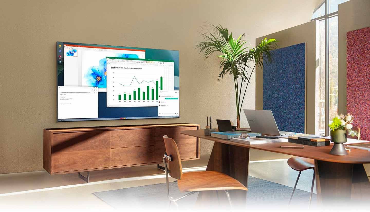 Zamień swój salon w domowe biuro lub salę lekcyjną. Skorzystaj z bezprzewodowego połączenia ze swoim komputerem, laptopem lub telefonem i ciesz się możliwością pracy zdalnej przed telewizorem. Funkcja obsługuje Office 365 oraz tryb Samsung DeX.